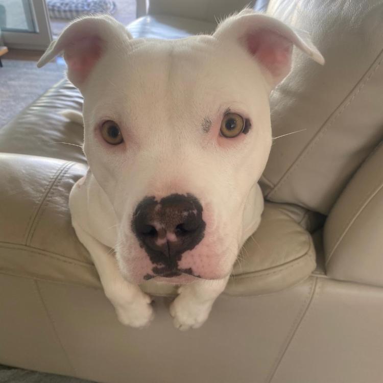 Gabby is a friendly, affectionate Staffy x who has been with us since January. She is 21kg, 20 months old, came from Geraldton as a rescue and has settled into our family wonderfully. We love her to bits!