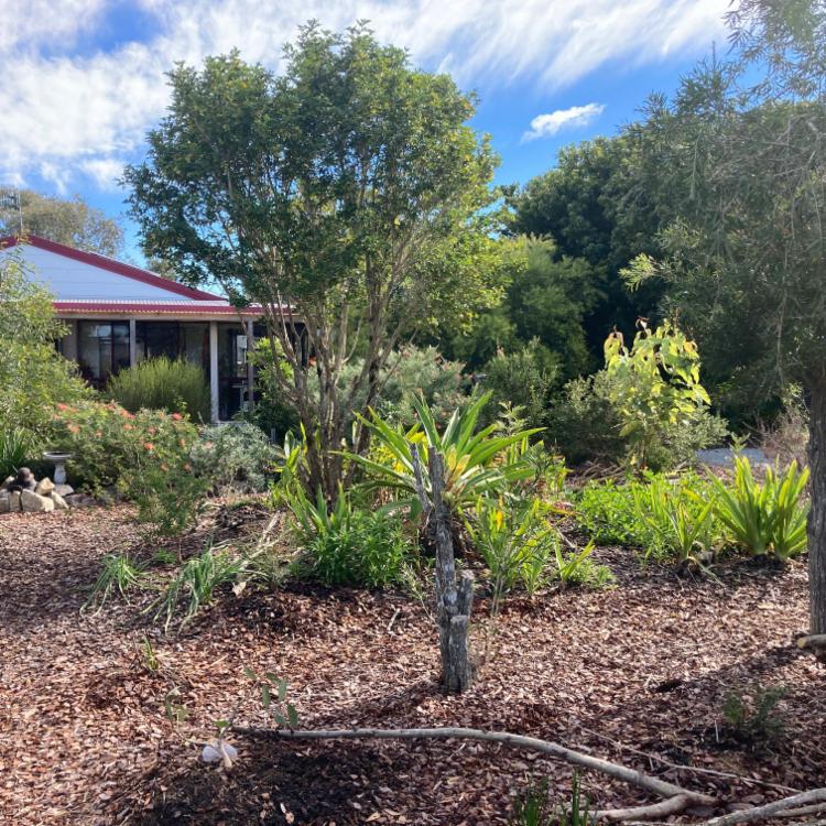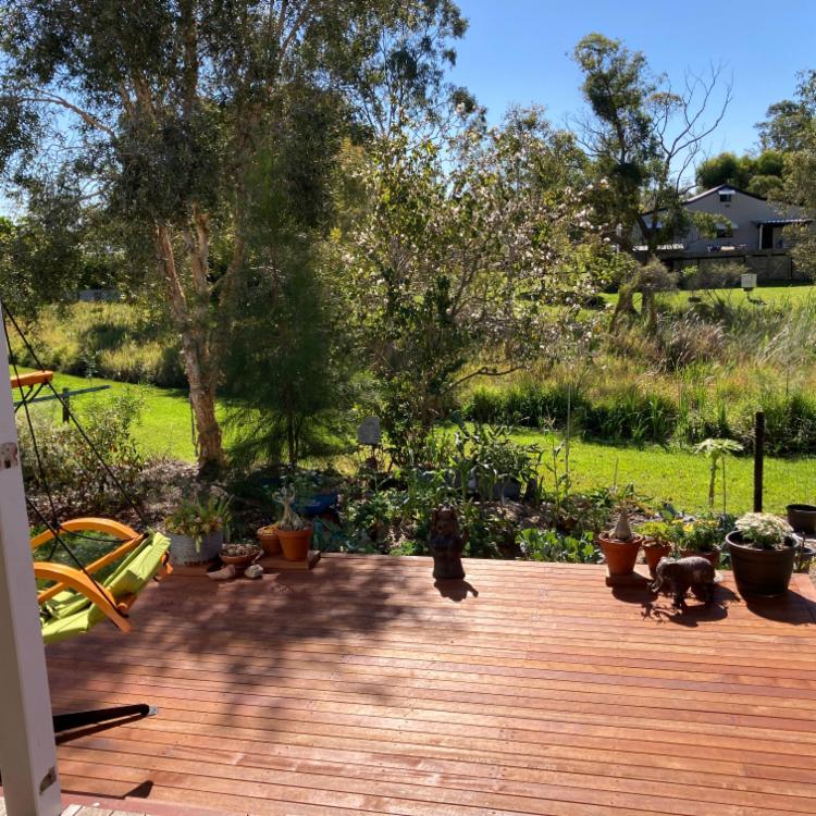 My house is a medium to small 2 bedroom place towards the end of a quiet cul de sac. It was a 3 bedroom house but I merged 2 small bedrooms to create a lovely room with a view. I also created a sweet little porch for backyard appreciation. I have also installed an aircon in the kitchen/living area but haven't felt the need for it in the bedrooms. Nice quiet fans in all rooms and on the porch. There are enclosed verandahs along the front (south) and east side of the house.