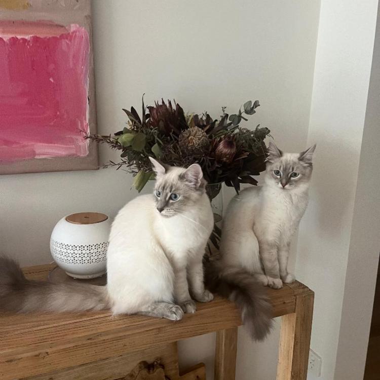 Mani is Bengal/Ragdoll cross, 11 years old, and Ash and Evie (sisters) are Ragdoll cross young cats turning 2 on 23 January. All get along well, love attention and are up for a play if you have time, otherwise happy to snooze and hang out. They are fed dry food morning and evening, along with water. The fish are fed every second day - that’s it for them!